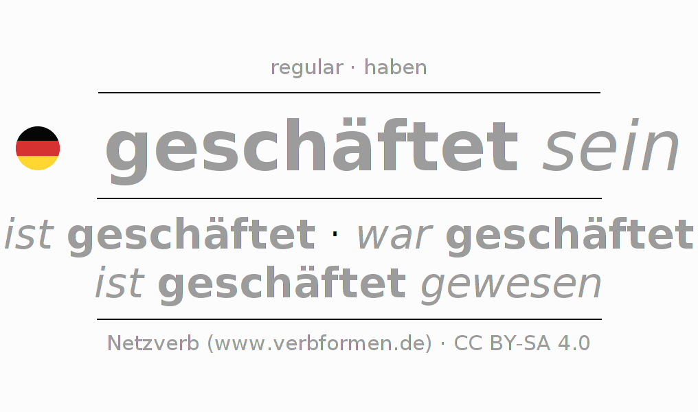 La conjugación de schäften en Participio Presente Pasado perfecto palabra del habla Pasivo situativo es geschäftet seiend, geschäftet gewesen.Para construir esta formas se requiere seguir algunas reglas gramaticales y también las especificaciones para la conjugación de verbos simples de schäften en Participio . Comentarios ☆