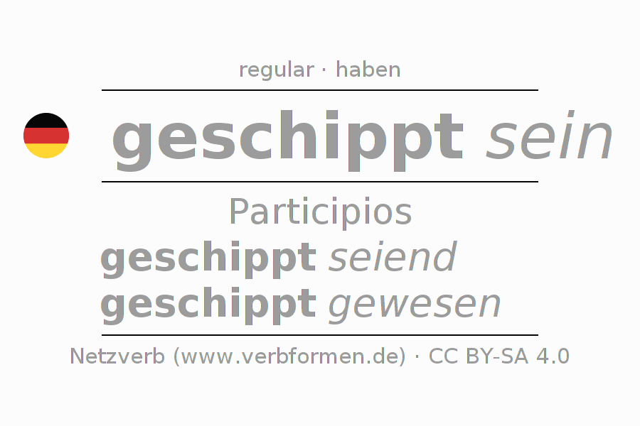 La conjugación de schippen en Participio Presente Pasado perfecto palabra del habla Pasivo situativo es geschippt seiend, geschippt gewesen.Para construir esta formas se requiere seguir algunas reglas gramaticales y también las especificaciones para la conjugación de verbos simples de schippen en Participio . Comentarios ☆