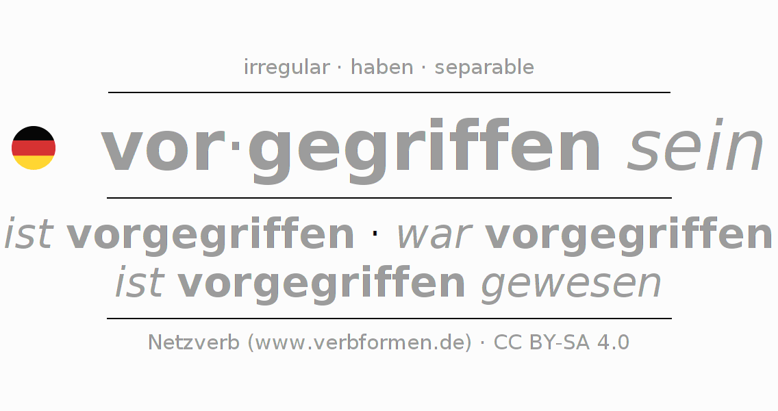 El verbo vorgreifen, conjugado completamente en todas las personas y números gramaticales en Participio Presente Pasado perfecto.
