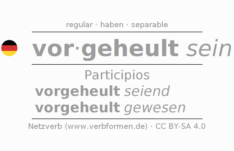 El verbo vorheulen, conjugado completamente en todas las personas y números gramaticales en Participio Presente Pasado perfecto.