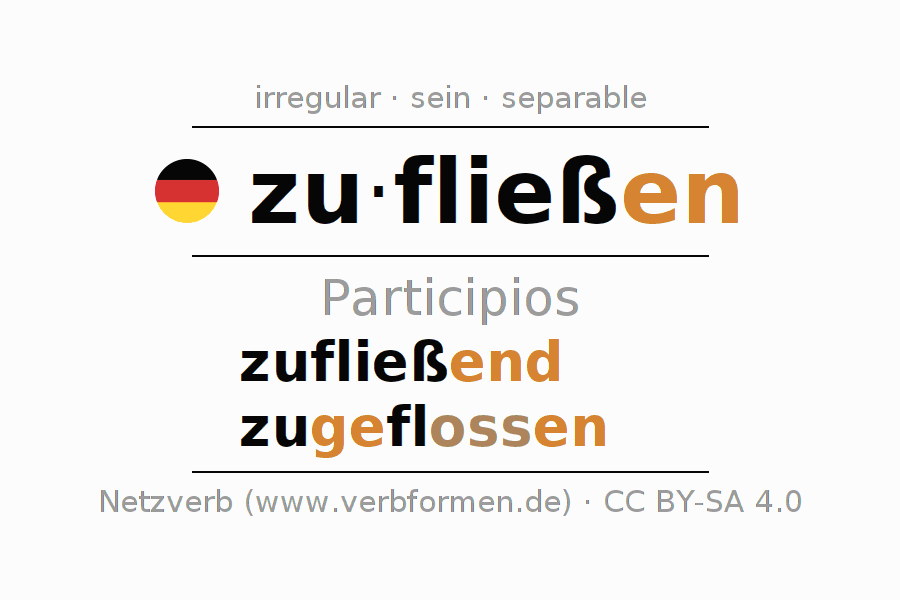 El verbo zufließen, conjugado completamente en todas las personas y números gramaticales en Participio Presente Pasado perfecto.