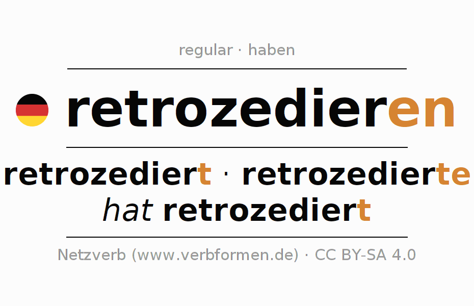 - Presente: retrozedier(e) (du), retrozedieren wir, retrozediert (ihr), retrozedieren Sie