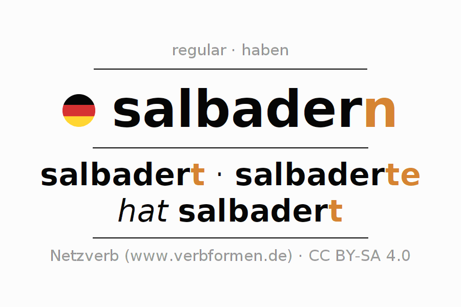 - Pasado perfecto: ich habe salbadert, du hast salbadert, er hat salbadert, wir haben salbadert, ihr habt salbadert, sie haben salbadert