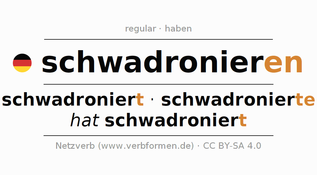 Tablas de verbos para la conjugación de schwadronieren en línea, representadas de forma simple, con todas las construcciones verbales en singular y plural, en todas las personas gramaticales (1ª persona, 2ª persona, 3ª persona). El practicar la conjugación del verbo schwadronieren es útil para tareas, exámenes, la escuela, la universidad, las clases de alemán y para los estudiantes adultos. Especialmente para los estudiantes del alemán es muy importante el conjugar los verbos y el formar las raíces verbales de forma correcta. Aquí encuentras más información acerca del tema Wiktionary schwadronieren und unter schwadronieren im Duden.