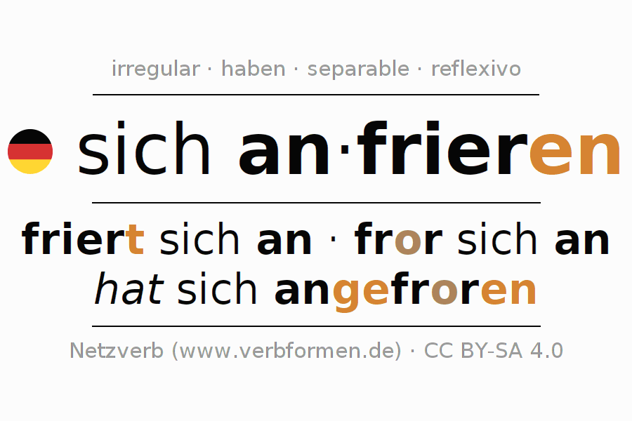 - Pasado perfecto: ich habe mir/mich angefroren, du habest dir/dich angefroren, er habe sich angefroren, wir haben uns angefroren, ihr habet euch angefroren, sie haben sich angefroren
