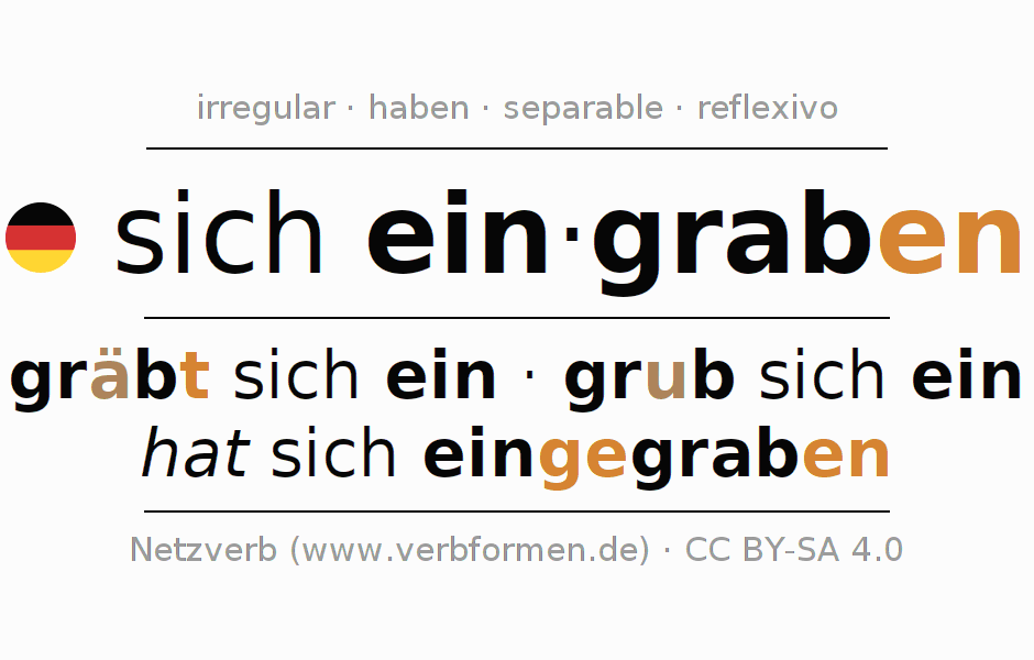 - Pasado perfecto: ich habe mir/mich eingegraben, du hast dir/dich eingegraben, er hat sich eingegraben, wir haben uns eingegraben, ihr habt euch eingegraben, sie haben sich eingegraben