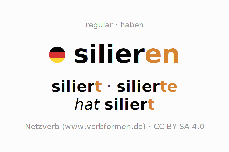 - Pasado perfecto: ich habe siliert, du hast siliert, er hat siliert, wir haben siliert, ihr habt siliert, sie haben siliert