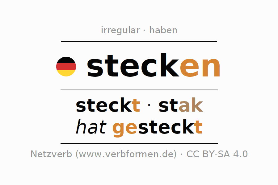 Tablas de verbos para la conjugación de stecken en línea, representadas de forma simple, con todas las construcciones verbales en singular y plural, en todas las personas gramaticales (1ª persona, 2ª persona, 3ª persona). El practicar la conjugación del verbo stecken es útil para tareas, exámenes, la escuela, la universidad, las clases de alemán y para los estudiantes adultos. Especialmente para los estudiantes del alemán es muy importante el conjugar los verbos y el formar las raíces verbales de forma correcta. Aquí encuentras más información acerca del tema Wiktionary stecken und unter stecken im Duden.