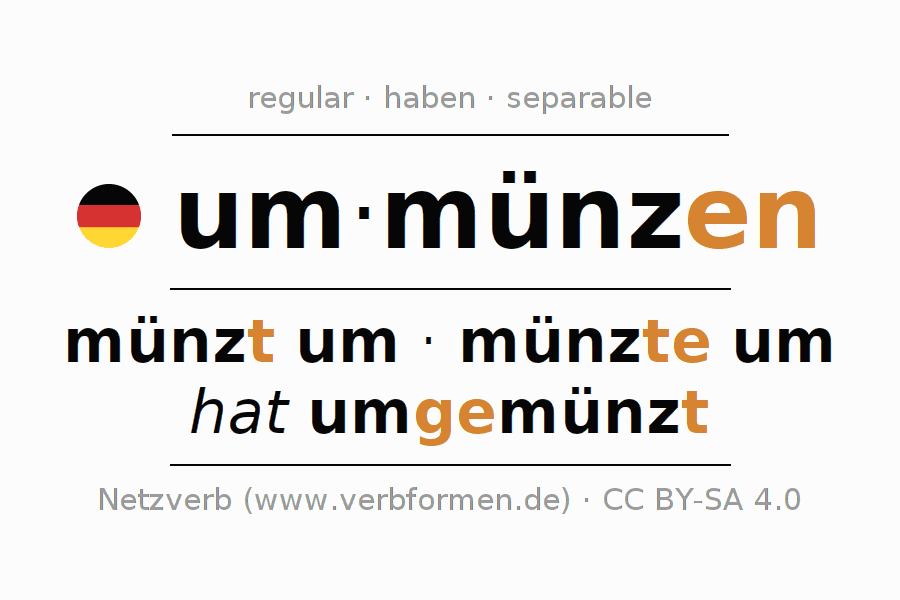 - Presente: münz(e) (du) um, münzen wir um, münzt (ihr) um, münzen Sie um