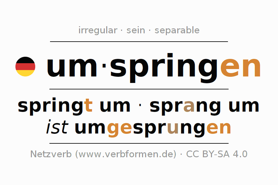 El verbo umspringen (cambiar abruptamente, cambiar de dirección) se conjuga de forma irregular (conjugación fuerte). Las formas básicas son springt um, sprang um y ist umgesprungen. La apofonía se realiza a través de las vocales base i - a - u. puesto que es un verbo auxiliar de umspringen se utiliza el verbo auxiliar "sein". Sin embargo, hay tiempos gramaticales con el verbo auxiliar "haben". La primera sílaba um- de umspringen es separable. Pero también puede aparecer como verbo separable. La inflexión se hace en el genero Activo y se presenta como Oración principal.. Para aprender mejor tenemos disponibles innumerables ejemplos para el uso del verbo umspringen. Para practicar y reforzar tenemos también hojas de trabajo gratuitas para umspringen. Aquí podrás conjugar, no solamente el verbo umspringen, sino también todos los verbos alemanes. Comentarios ☆