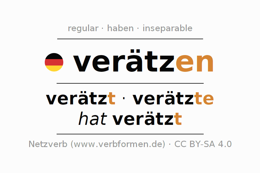 - Pasado perfecto: ich habe verätzt, du hast verätzt, er hat verätzt, wir haben verätzt, ihr habt verätzt, sie haben verätzt
