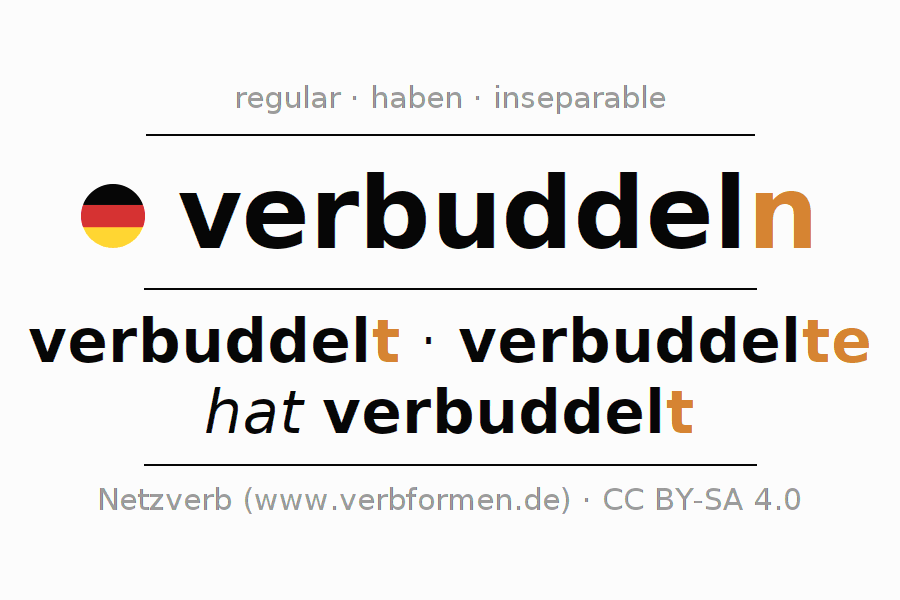 - Pasado perfecto: ich habe verbuddelt, du hast verbuddelt, er hat verbuddelt, wir haben verbuddelt, ihr habt verbuddelt, sie haben verbuddelt