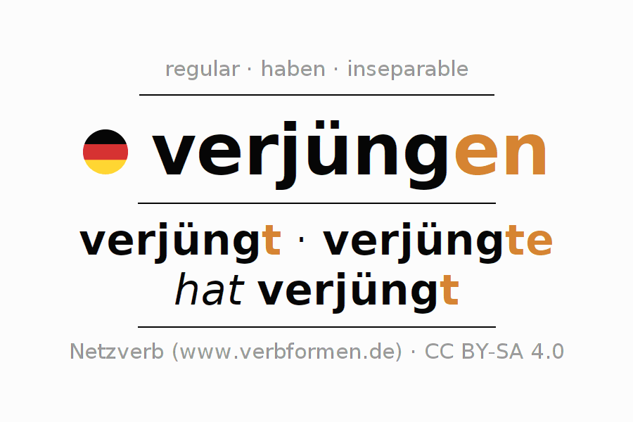 - Pasado perfecto: ich habe verjüngt, du habest verjüngt, er habe verjüngt, wir haben verjüngt, ihr habet verjüngt, sie haben verjüngt