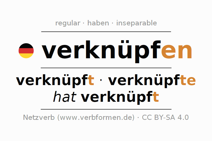 - Pasado perfecto: ich habe verknüpft, du hast verknüpft, er hat verknüpft, wir haben verknüpft, ihr habt verknüpft, sie haben verknüpft