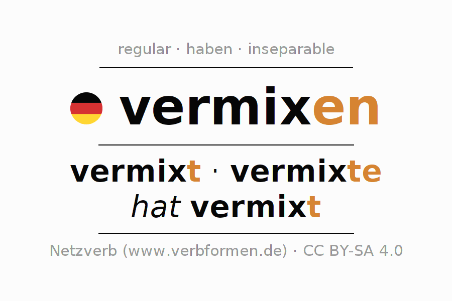 - Presente: vermix(e) (du), vermixen wir, vermixt (ihr), vermixen Sie