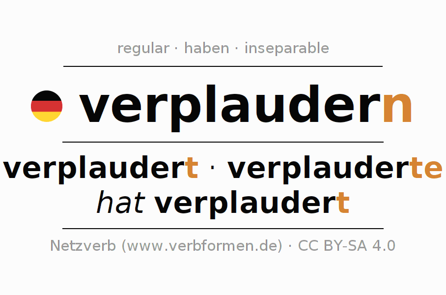 - Pasado perfecto: ich habe verplaudert, du habest verplaudert, er habe verplaudert, wir haben verplaudert, ihr habet verplaudert, sie haben verplaudert