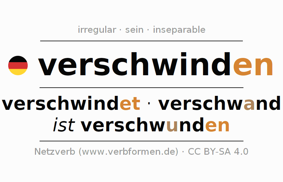 - Pretérito: ich verschwand, du verschwand(e)st, er verschwand, wir verschwanden, ihr verschwandet, sie verschwanden