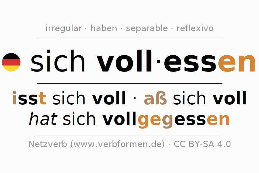 - Pasado perfecto: ich habe mir/mich vollgegessen, du hast dir/dich vollgegessen, er hat sich vollgegessen, wir haben uns vollgegessen, ihr habt euch vollgegessen, sie haben sich vollgegessen