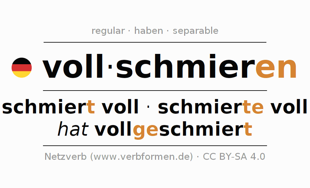 - Presente: schmier(e) (du) voll, schmieren wir voll, schmiert (ihr) voll, schmieren Sie voll