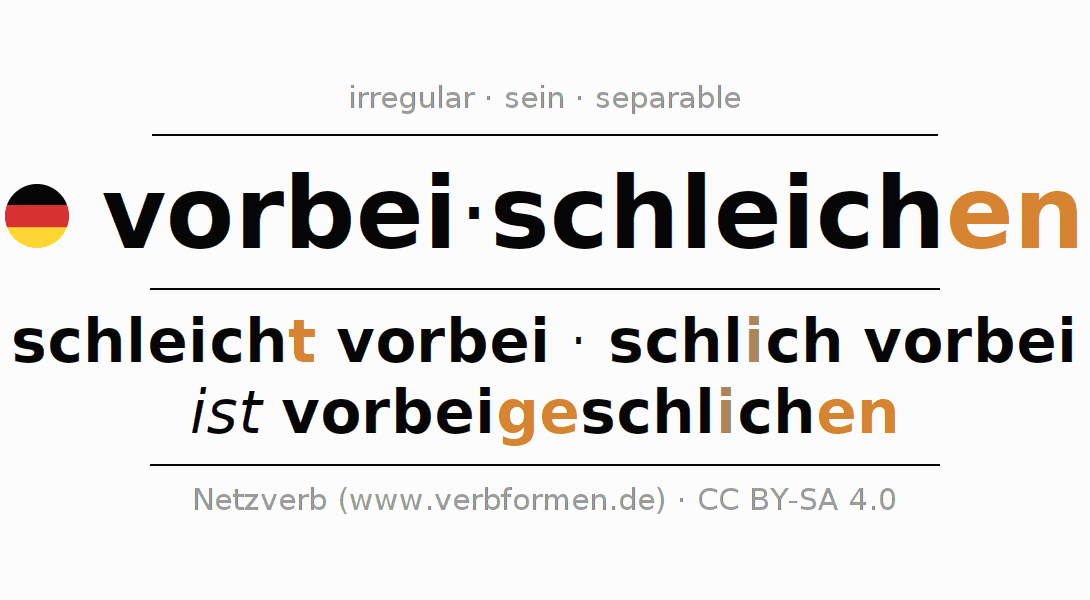 - Pasado perfecto: ich bin vorbeigeschlichen, du bist vorbeigeschlichen, er ist vorbeigeschlichen, wir sind vorbeigeschlichen, ihr seid vorbeigeschlichen, sie sind vorbeigeschlichen