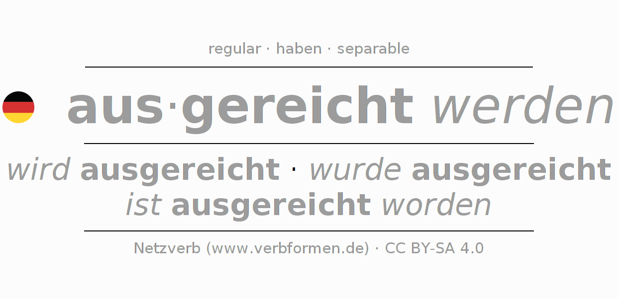 Tablas de verbos para la conjugación de aus·gereicht werden en línea, representadas de forma simple, con todas las construcciones verbales en singular y plural, en todas las personas gramaticales (1ª persona, 2ª persona, 3ª persona). El practicar la conjugación del verbo aus·gereicht werden es útil para tareas, exámenes, la escuela, la universidad, las clases de alemán y para los estudiantes adultos. Especialmente para los estudiantes del alemán es muy importante el conjugar los verbos y el formar las raíces verbales de forma correcta. Aquí encuentras más información acerca del tema Wiktionary ausreichen und unter ausreichen im Duden.