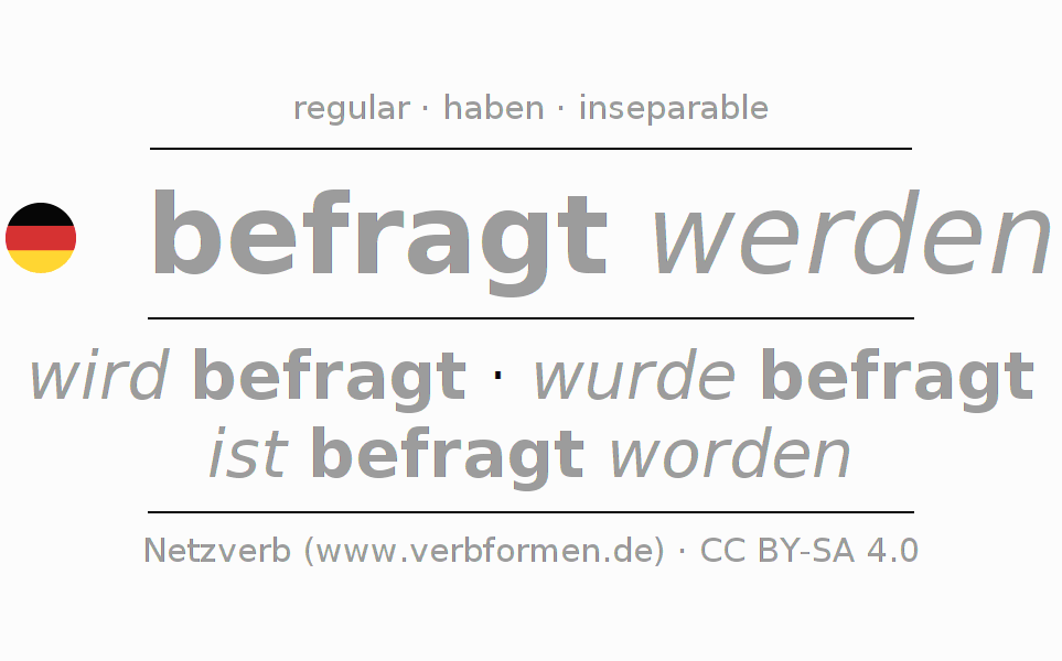 - Futuro II: ich werde befragt worden sein, du wirst befragt worden sein, er wird befragt worden sein, wir werden befragt worden sein, ihr werdet befragt worden sein, sie werden befragt worden sein