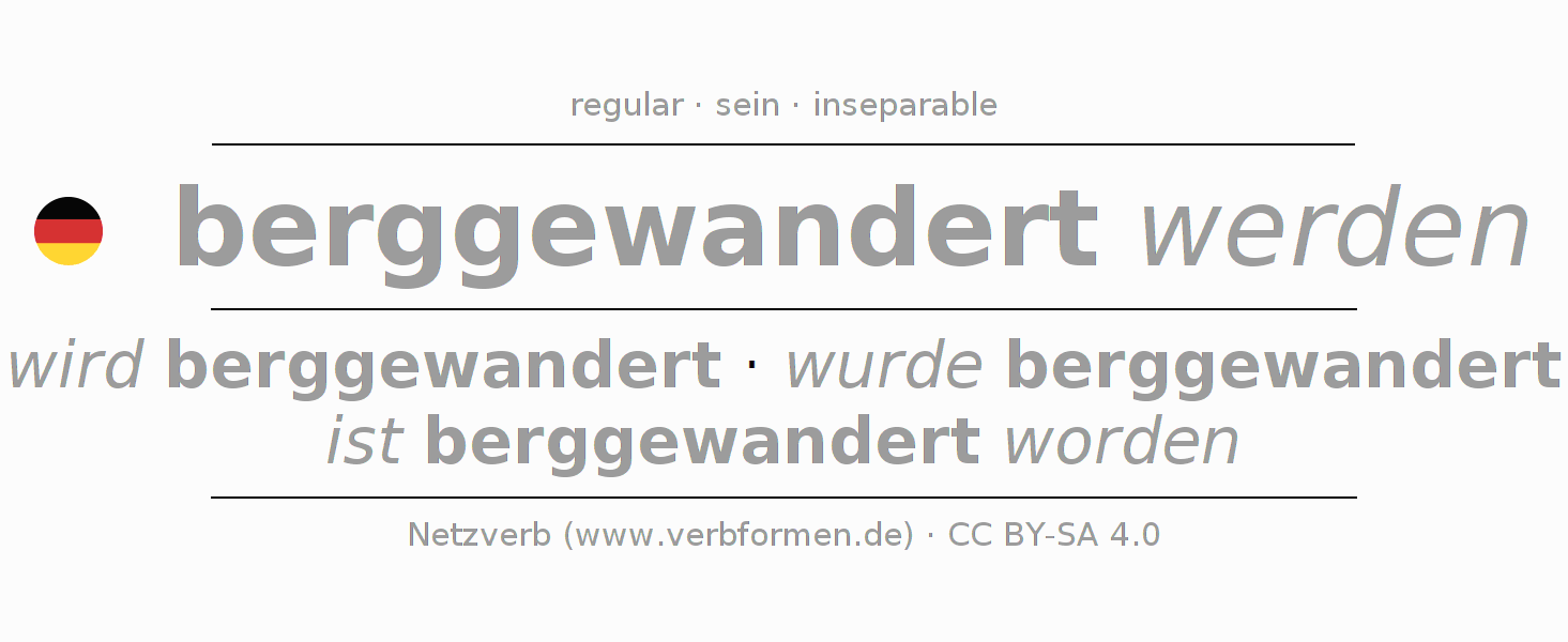 - Presente: ich werde berggewandert, du wirst berggewandert, er wird berggewandert, wir werden berggewandert, ihr werdet berggewandert, sie werden berggewandert