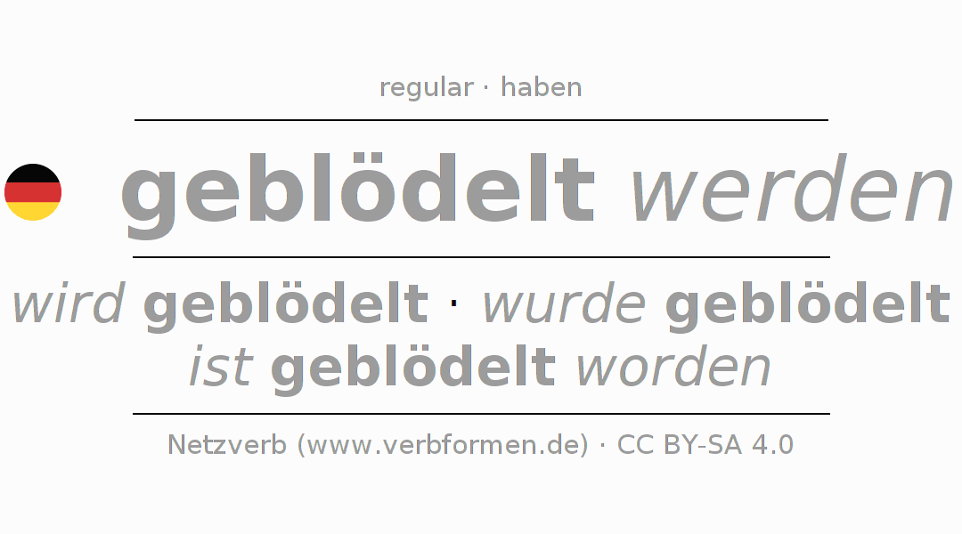 - Pasado perfecto: ich bin geblödelt worden, du bist geblödelt worden, er ist geblödelt worden, wir sind geblödelt worden, ihr seid geblödelt worden, sie sind geblödelt worden