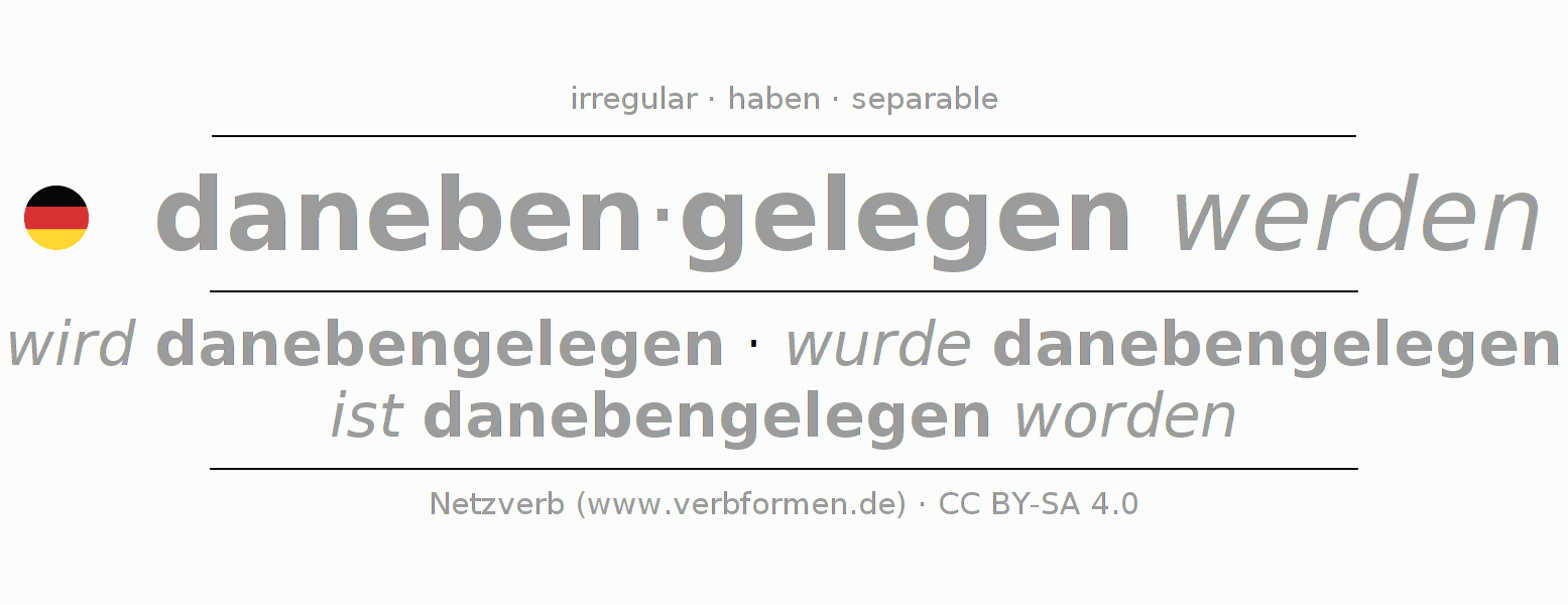 - Pasado perfecto: ich bin danebengelegen worden, du bist danebengelegen worden, er ist danebengelegen worden, wir sind danebengelegen worden, ihr seid danebengelegen worden, sie sind danebengelegen worden
