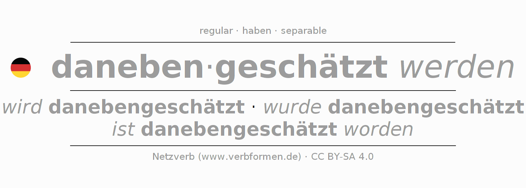- Presente: ich werde danebengeschätzt, du wirst danebengeschätzt, er wird danebengeschätzt, wir werden danebengeschätzt, ihr werdet danebengeschätzt, sie werden danebengeschätzt