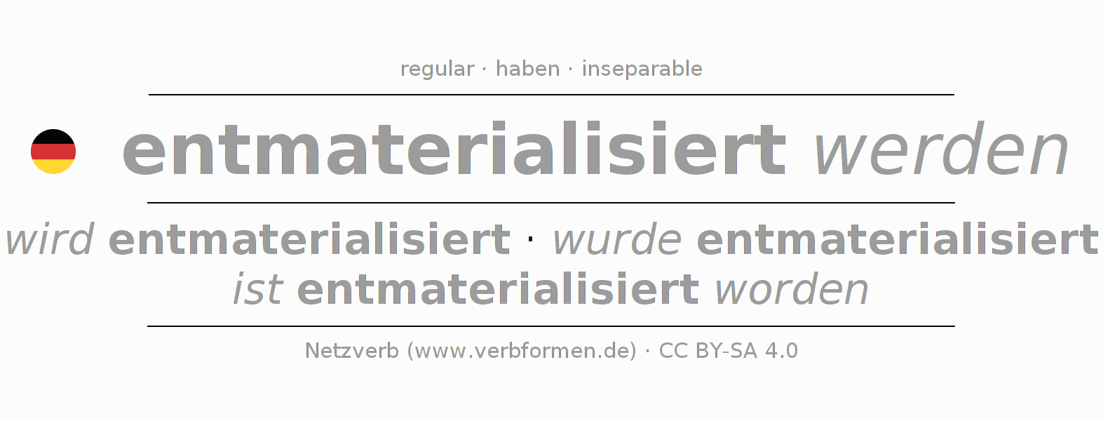 | ich | werde entmaterialisiert | wurde entmaterialisiert | werde entmaterialisiert | würde entmaterialisiert | - |