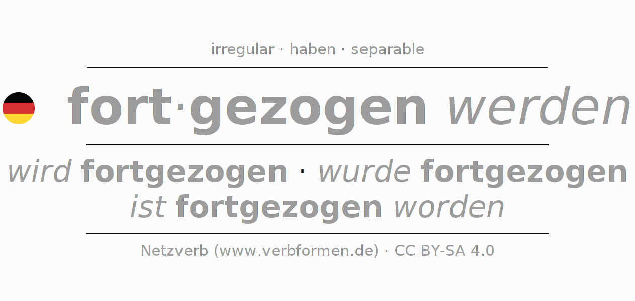 Tablas de verbos para la conjugación de fort·gezogen werden en línea, representadas de forma simple, con todas las construcciones verbales en singular y plural, en todas las personas gramaticales (1ª persona, 2ª persona, 3ª persona). El practicar la conjugación del verbo fort·gezogen werden es útil para tareas, exámenes, la escuela, la universidad, las clases de alemán y para los estudiantes adultos. Especialmente para los estudiantes del alemán es muy importante el conjugar los verbos y el formar las raíces verbales de forma correcta. Aquí encuentras más información acerca del tema Wiktionary fortziehen und unter fortziehen im Duden.