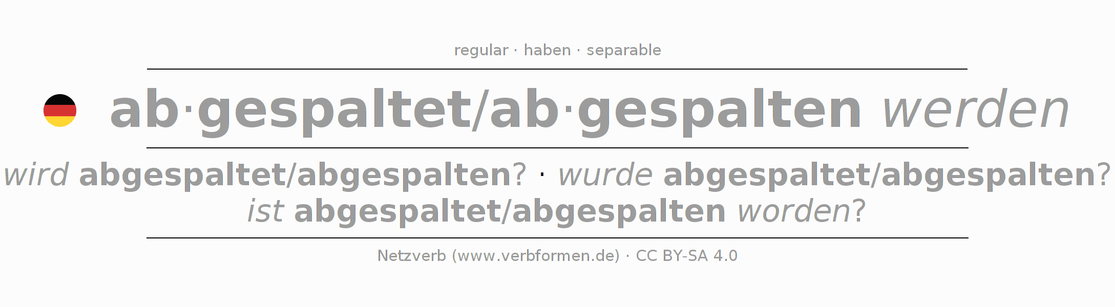 | ich | werde abgespaltet/abgespalten? | wurde abgespaltet/abgespalten? | werde abgespaltet/abgespalten? | würde abgespaltet/abgespalten? | - |