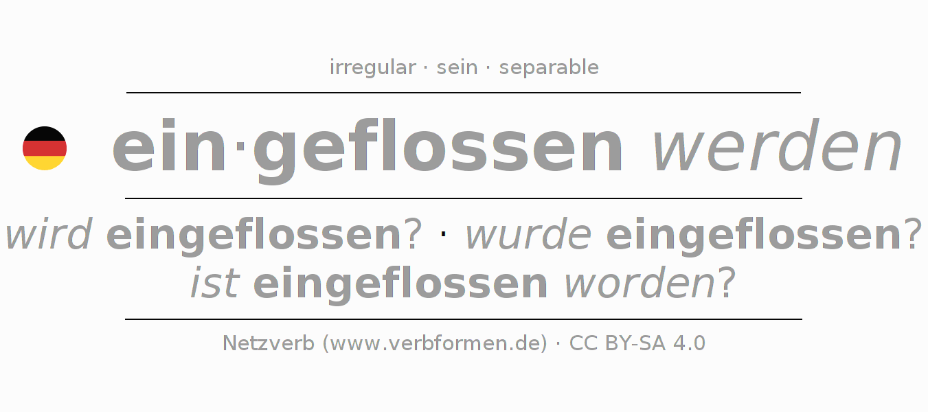 - Futuro I: werde ich eingeflossen werden?, werdest du eingeflossen werden?, werde er eingeflossen werden?, werden wir eingeflossen werden?, werdet ihr eingeflossen werden?, werden sie eingeflossen werden?