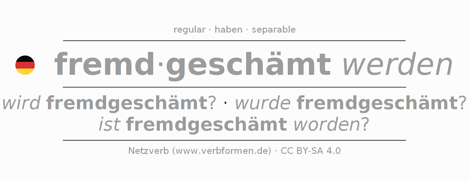- Futuro II: werde ich fremdgeschämt worden sein?, werdest du fremdgeschämt worden sein?, werde er fremdgeschämt worden sein?, werden wir fremdgeschämt worden sein?, werdet ihr fremdgeschämt worden sein?, werden sie fremdgeschämt worden sein?