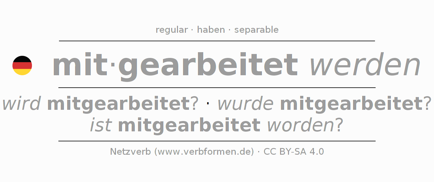 - Pretérito: wurde ich mitgearbeitet?, wurdest du mitgearbeitet?, wurde er mitgearbeitet?, wurden wir mitgearbeitet?, wurdet ihr mitgearbeitet?, wurden sie mitgearbeitet?