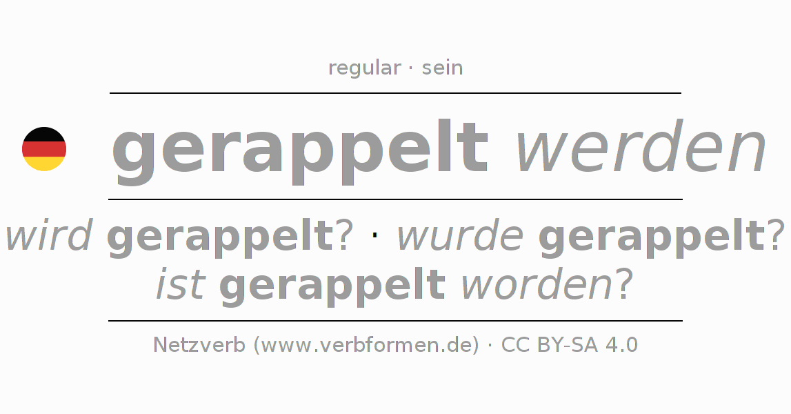 - Pasado perfecto: bin ich gerappelt worden?, bist du gerappelt worden?, ist er gerappelt worden?, sind wir gerappelt worden?, seid ihr gerappelt worden?, sind sie gerappelt worden?