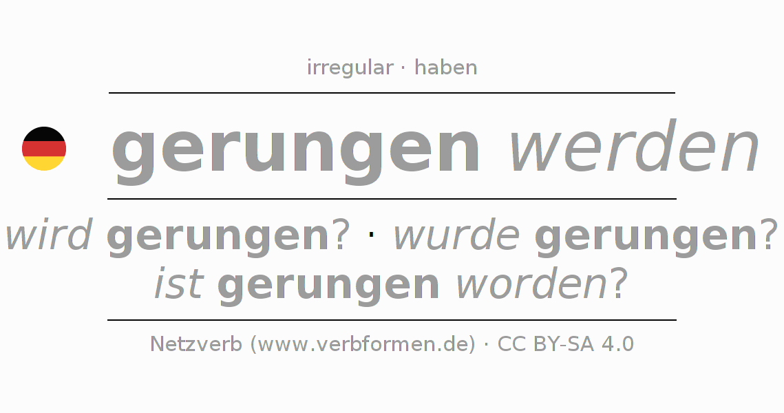 Tablas de verbos para la conjugación de gerungen werden en línea, representadas de forma simple, con todas las construcciones verbales en singular y plural, en todas las personas gramaticales (1ª persona, 2ª persona, 3ª persona). El practicar la conjugación del verbo gerungen werden es útil para tareas, exámenes, la escuela, la universidad, las clases de alemán y para los estudiantes adultos. Especialmente para los estudiantes del alemán es muy importante el conjugar los verbos y el formar las raíces verbales de forma correcta. Aquí encuentras más información acerca del tema Wiktionary ringen und unter ringen im Duden.