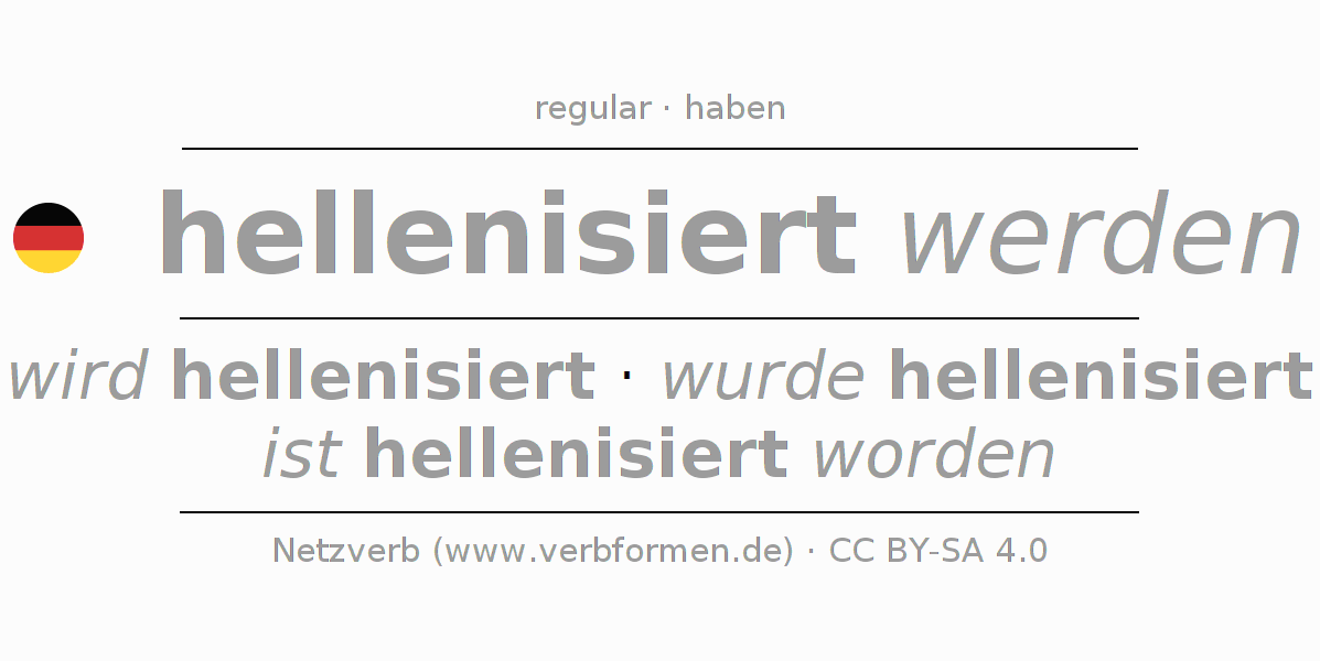- Futuro II: ich werde hellenisiert worden sein, du werdest hellenisiert worden sein, er werde hellenisiert worden sein, wir werden hellenisiert worden sein, ihr werdet hellenisiert worden sein, sie werden hellenisiert worden sein