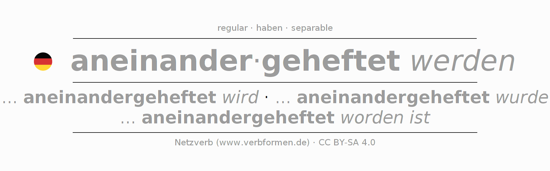 | ich | ... aneinandergeheftet werde | ... aneinandergeheftet wurde | ... aneinandergeheftet werde | ... aneinandergeheftet würde | - |