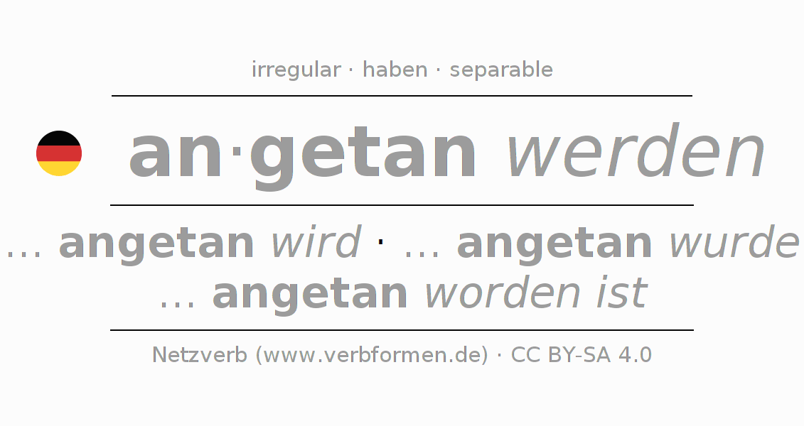 Tablas de verbos para la conjugación de an·getan werden en línea, representadas de forma simple, con todas las construcciones verbales en singular y plural, en todas las personas gramaticales (1ª persona, 2ª persona, 3ª persona). El practicar la conjugación del verbo an·getan werden es útil para tareas, exámenes, la escuela, la universidad, las clases de alemán y para los estudiantes adultos. Especialmente para los estudiantes del alemán es muy importante el conjugar los verbos y el formar las raíces verbales de forma correcta. Aquí encuentras más información acerca del tema Wiktionary antun und unter antun im Duden.