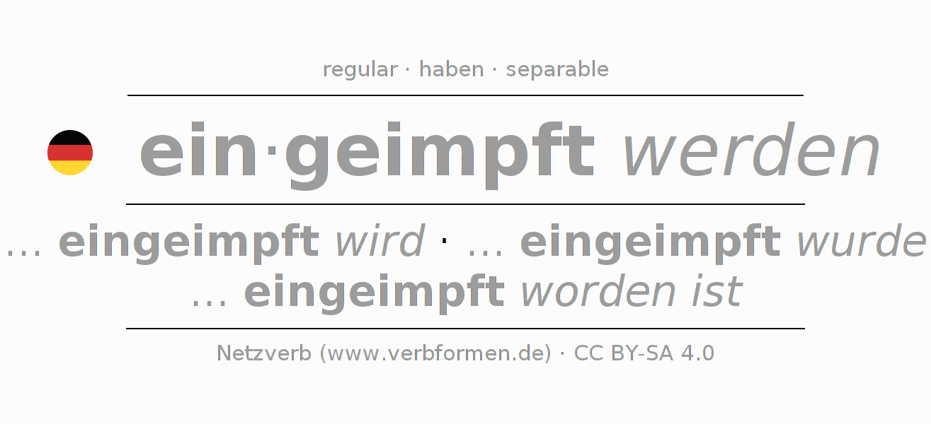- Presente: ... ich eingeimpft werde, ... du eingeimpft wirst, ... er eingeimpft wird, ... wir eingeimpft werden, ... ihr eingeimpft werdet, ... sie eingeimpft werden