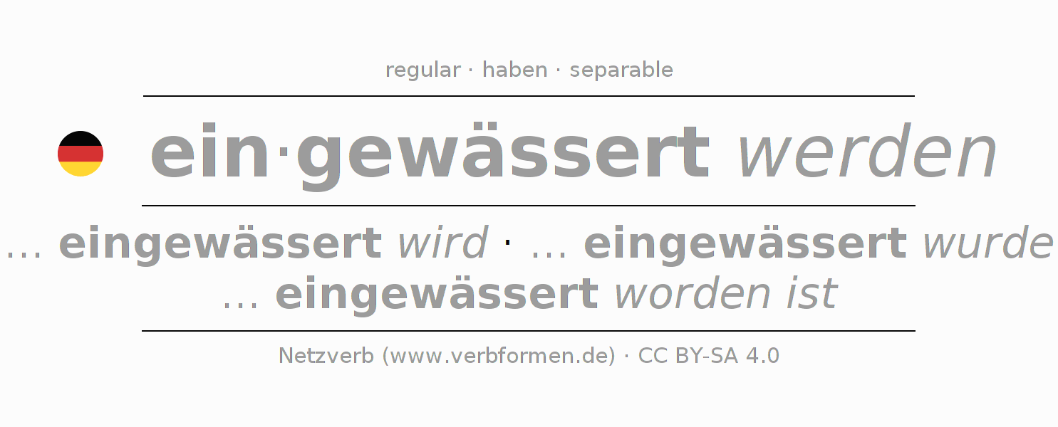 Tablas de verbos para la conjugación de ein·gewässert werden en línea, representadas de forma simple, con todas las construcciones verbales en singular y plural, en todas las personas gramaticales (1ª persona, 2ª persona, 3ª persona). El practicar la conjugación del verbo ein·gewässert werden es útil para tareas, exámenes, la escuela, la universidad, las clases de alemán y para los estudiantes adultos. Especialmente para los estudiantes del alemán es muy importante el conjugar los verbos y el formar las raíces verbales de forma correcta. Aquí encuentras más información acerca del tema Wiktionary einwässern und unter einwässern im Duden.