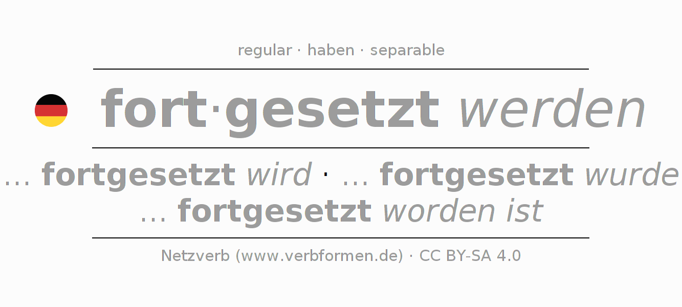 - Futuro II: ... ich fortgesetzt worden sein werde, ... du fortgesetzt worden sein wirst, ... er fortgesetzt worden sein wird, ... wir fortgesetzt worden sein werden, ... ihr fortgesetzt worden sein werdet, ... sie fortgesetzt worden sein werden