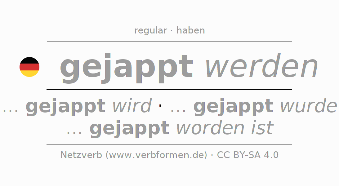 - Futuro I: ... ich gejappt werden werde, ... du gejappt werden wirst, ... er gejappt werden wird, ... wir gejappt werden werden, ... ihr gejappt werden werdet, ... sie gejappt werden werden