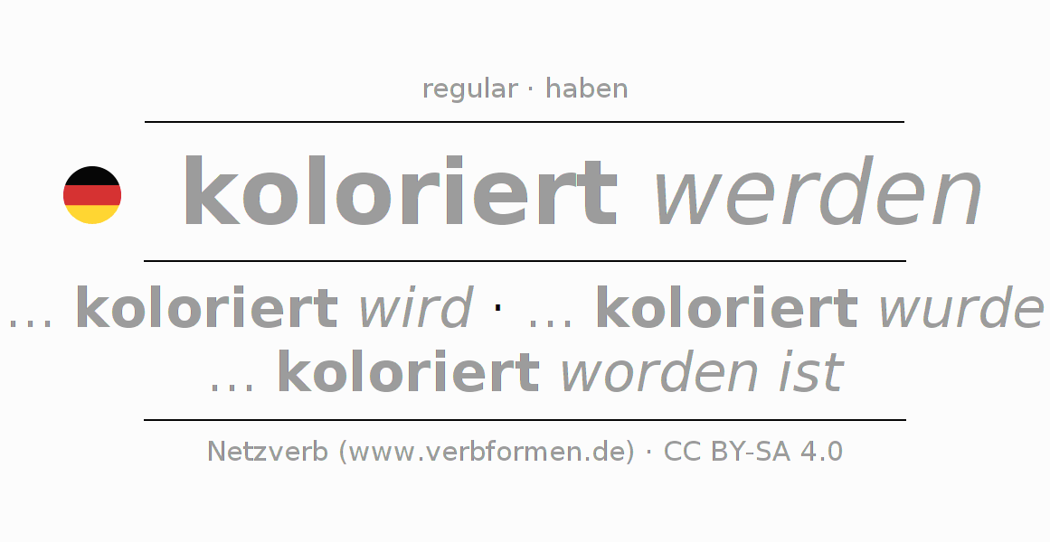 - Futuro I: ... ich koloriert werden werde, ... du koloriert werden wirst, ... er koloriert werden wird, ... wir koloriert werden werden, ... ihr koloriert werden werdet, ... sie koloriert werden werden