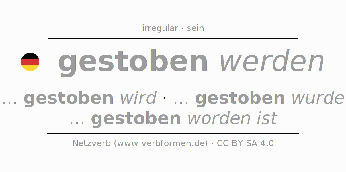 - Futuro I: ... ich gestoben werden werde, ... du gestoben werden wirst, ... er gestoben werden wird, ... wir gestoben werden werden, ... ihr gestoben werden werdet, ... sie gestoben werden werden