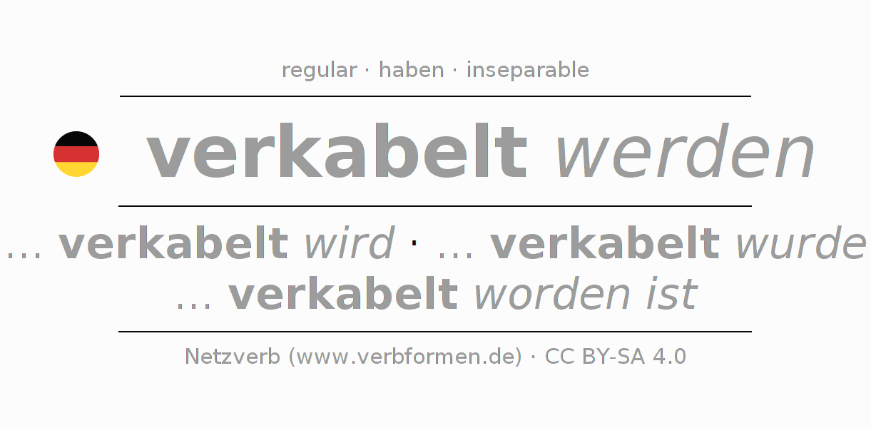 - Futuro I: ... ich verkabelt werden werde, ... du verkabelt werden werdest, ... er verkabelt werden werde, ... wir verkabelt werden werden, ... ihr verkabelt werden werdet, ... sie verkabelt werden werden