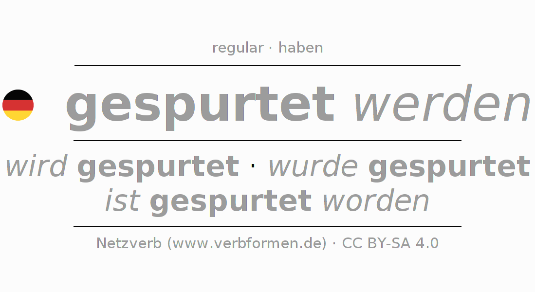 - Pasado perfecto: ich bin gespurtet worden, du bist gespurtet worden, er ist gespurtet worden, wir sind gespurtet worden, ihr seid gespurtet worden, sie sind gespurtet worden