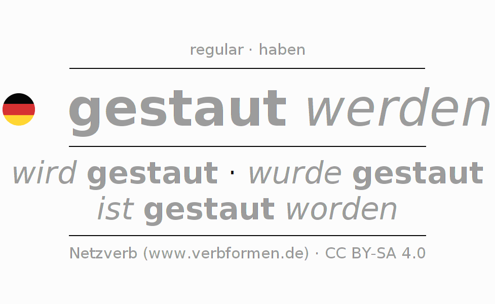 Tablas de verbos para la conjugación de gestaut werden en línea, representadas de forma simple, con todas las construcciones verbales en singular y plural, en todas las personas gramaticales (1ª persona, 2ª persona, 3ª persona). El practicar la conjugación del verbo gestaut werden es útil para tareas, exámenes, la escuela, la universidad, las clases de alemán y para los estudiantes adultos. Especialmente para los estudiantes del alemán es muy importante el conjugar los verbos y el formar las raíces verbales de forma correcta. Aquí encuentras más información acerca del tema Wiktionary stauen und unter stauen im Duden.